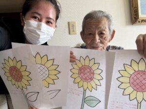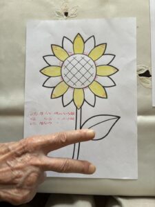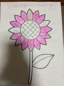 ヒマワリのぬり絵をお渡しし、1日1枚花びらに色を塗るという方式。これが大当たり!ご自分なりのルールできっちり塗り進め、自ら用紙をコピーをして、気付いたら2枚目、3枚目…自然と自主トレが定着しました!