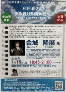 楠の杜訪問看護ステーションでは、2024年10月に、わが国の臨床倫理、特にナラティヴエシックス(物語の倫理)研究の第一人者である琉球大学病院の金城隆展先生をお招きして、「病や老いのものがたり」を共に紡ぐことをテーマに講演会を開催しました。 そして、2026年1月16日、金城先生が再び調布に降臨!今回のテーマは「認知症ケア」。高齢者の5人に1人、すぐ身近にいる人が認知症になる時代に避けては通れないテーマです。