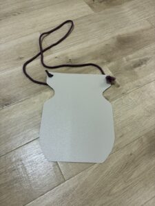 作り方:100円ショップで売っているPPシートや下敷き、ファイル等を型紙通りにカットして、パンチで穴を開けて、使う人の長さに合わせて紐を通す