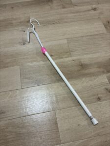 作り方:針金ハンガーを伸ばして、使いやすい角度に調整して曲げる。棒に結束バンドなどで固定。今回は突っ張り棒に差し込んでプラスチック粘土で固定しています。